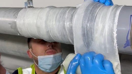 Video showing a leaking step joint repair at Bahrain International Airport made using SylWrap products to a 100mm UPVC pipe whilst the system remained live
