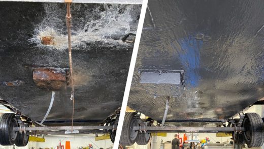Wastewater holding tanks underneath two luxury portable toilet trailers undergo repair and strengthening after heavy corrosion weakened and breached the metalwork