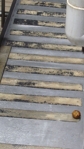 Masking tape was used to mark out where the anti slip strips were required and the exposed surface painted with Liquid Metal. Whist the epoxy coating remained tacky, silicon carbide grit was sprinkled over the top. The masking tape was then removed.
