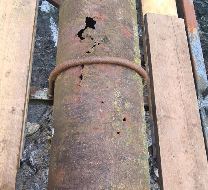 On inspection, the pipe was discovered to be totally covered in corrosion. This had eaten completely through the steel in several places along the top of the pipe, leaving large holes in the brittle surface.